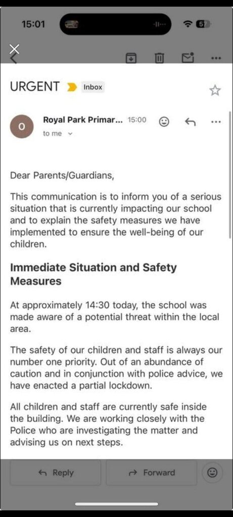 Royal Park Primary School sent out a message to parents/guardians at 2.30pm yesterday warning of the threat and that all pupils and staff had been secured inside the building.